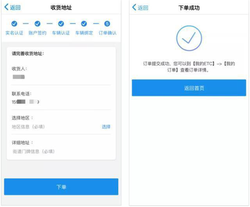 ⑥ 訂單確認(rèn):車輛綁定成功后,填寫收貨地址并下單。下單完成后,發(fā)行方會(huì)根據(jù)申請(qǐng)人填寫的收貨地址進(jìn)行OBU發(fā)貨。