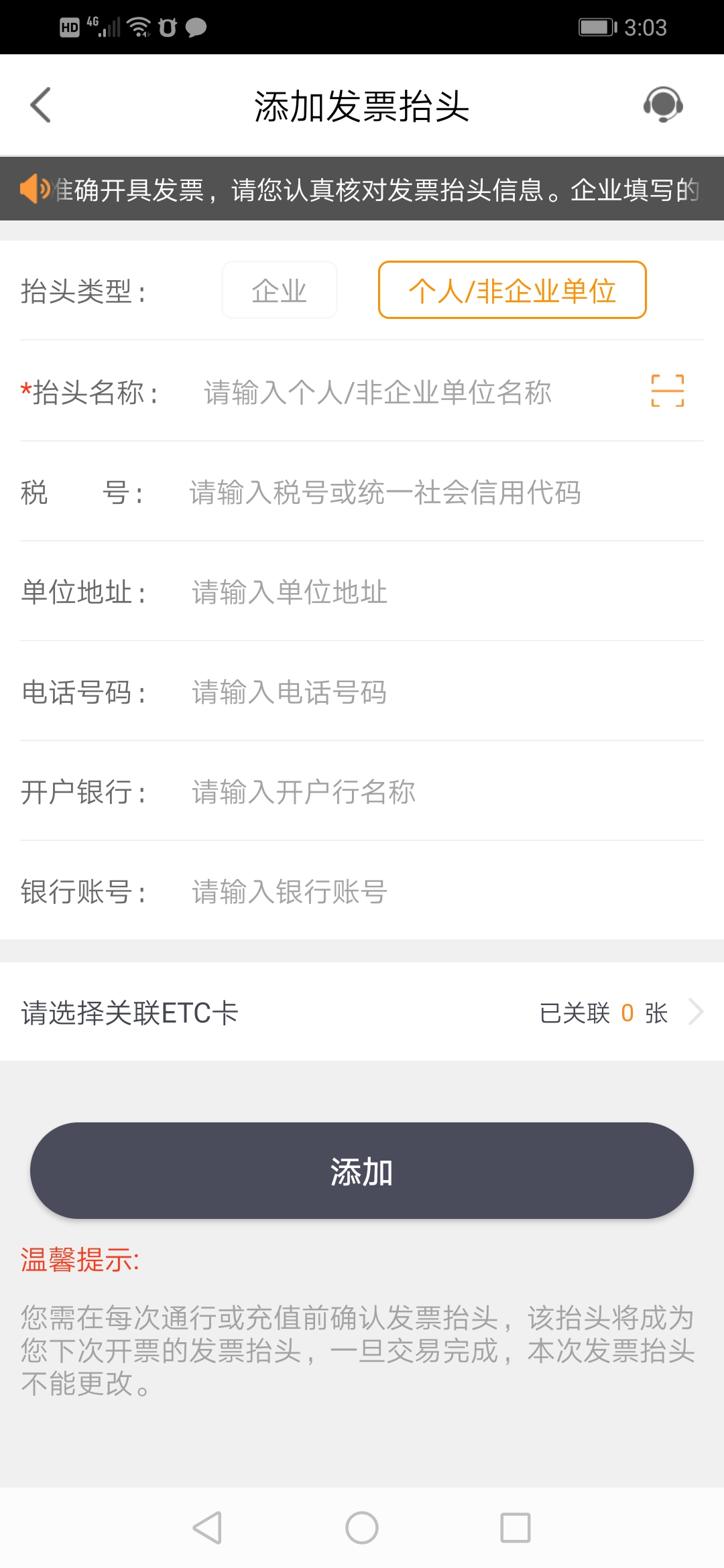 綁卡完成后,添加發(fā)票抬頭,勾選一張需要設(shè)置發(fā)票抬頭的ETC卡,添加開票信息,選擇抬頭信息,并點(diǎn)擊【關(guān)聯(lián)】