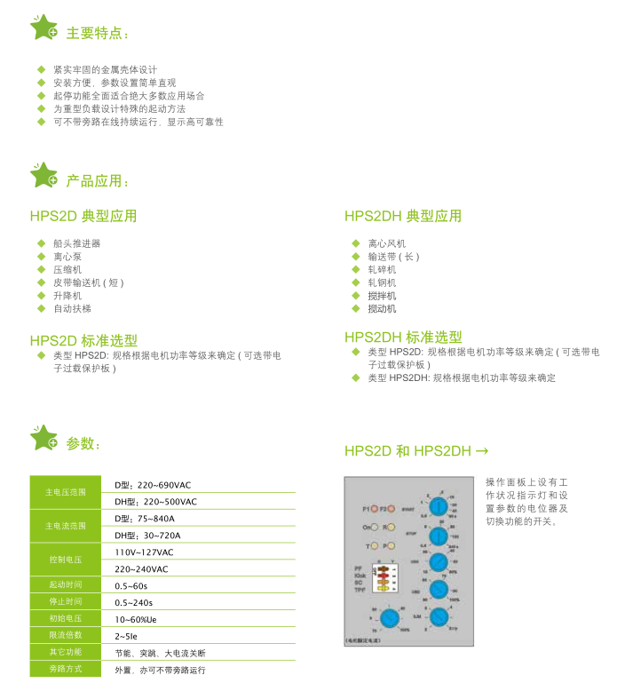 HPS2D75...840HPS2DH30...720 軟起動器均有著堅固的金屬殼體設(shè)計,可分別適用于常規(guī)負載和重型負載的各種應(yīng)用場合它結(jié)構(gòu)牢固緊湊,安裝方便快捷。所有參數(shù)和功能選項均通過前面板上的調(diào)節(jié)電位器和功能切換開關(guān)來設(shè)定和選擇。直觀清晰,各工作階段和狀態(tài)及故障均有相應(yīng)LED 指示讓用戶一目了然。特設(shè)節(jié)能功能,當電機運行在空載或輕載時自動降低負載電壓,