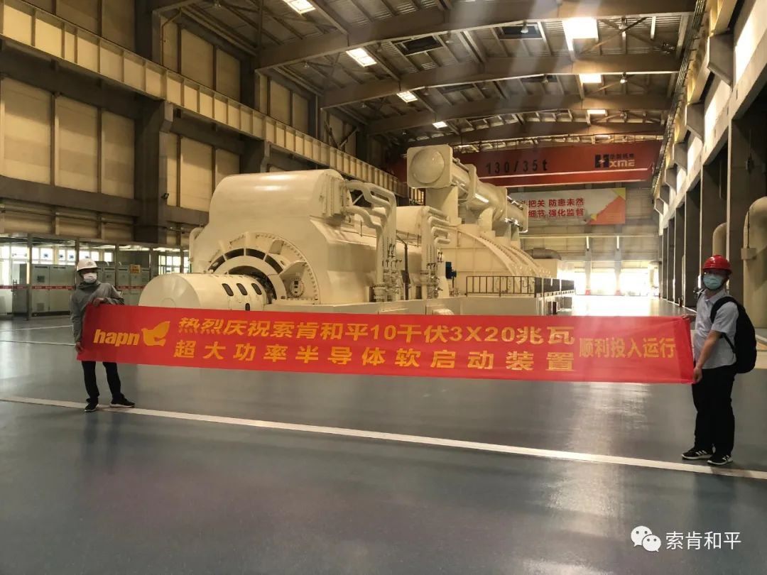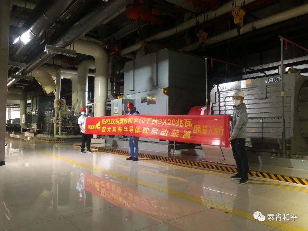 2020年5月20日,在索肯和平(上海)電氣總經(jīng)理陳勇,工程師潘工、趙工、呂工,能源公司王副總經(jīng)理、電氣總工程師李總工和電氣負(fù)責(zé)人杜工等相關(guān)人員協(xié)同下,20兆瓦級高壓固態(tài)軟起動(dòng)裝置一次啟動(dòng)完美成功,代表著能源公司二期工程勝利完工。